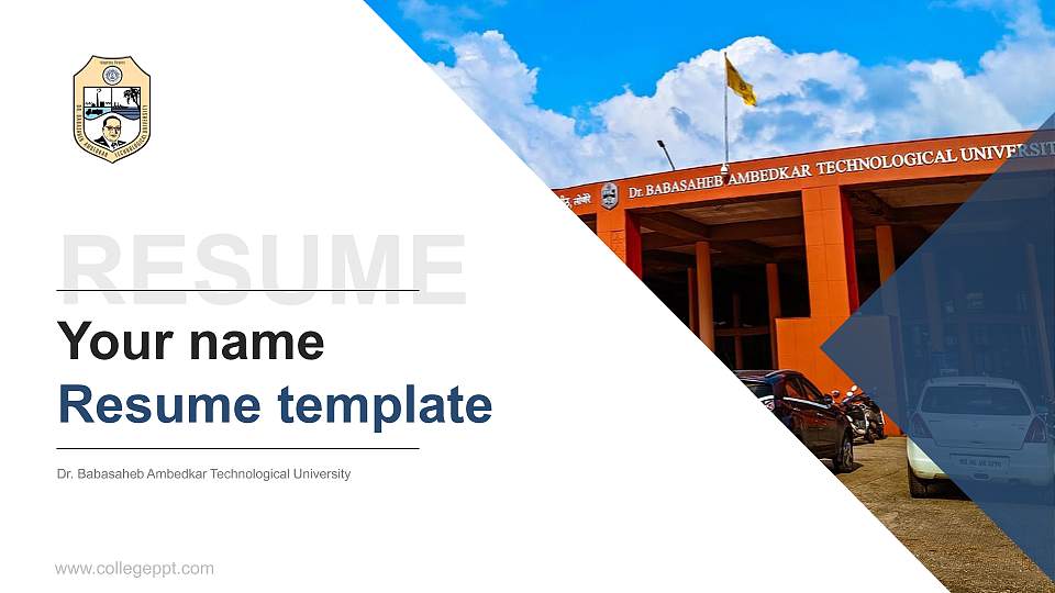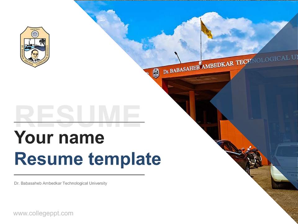 This Resume template features a matching cover, school emblem, and theme colors for Dr. Babasaheb Ambedkar Technological University. After purchase, you can modify theme colors, edit slide content, and master slides. Find this template with keywords like Resume, Dr. Babasaheb Ambedkar Technological University PPT template, PPT template, and more.