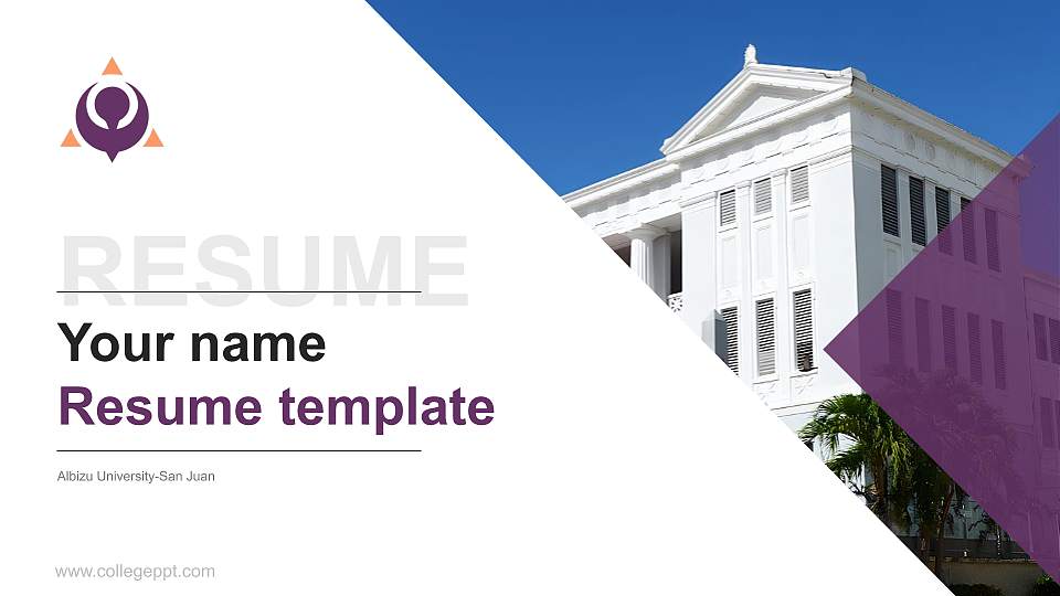 Templat ini untuk Resume menampilkan muka depan, lambang sekolah, dan warna tema yang sepadan khusus untuk Albizu University-San Juan. Selepas pembelian, anda boleh mengubah warna tema, mengedit kandungan slaid, dan slaid induk. Anda boleh mencari templat ini menggunakan kata kunci seperti Albizu University-San Juan, templat PPT Resume, templat PPT, dan banyak lagi.