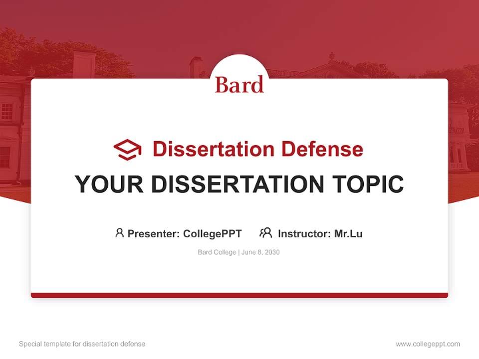 This Thesis Defense template features a matching cover, school emblem, and theme colors for Bard College. After purchase, you can modify theme colors, edit slide content, and master slides. Find this template with keywords like Thesis Defense, Bard College PPT template, PPT template, and more.