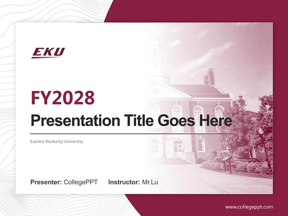 此模板用于学术,具有与东肯塔基大学匹配的封面、校徽和主题色。购买后,您可以修改主题色、编辑幻灯片内容以及母版幻灯片。您可以通过东肯塔基大学、学术 PPT模板、PPT模板等关键词找到该模板。
