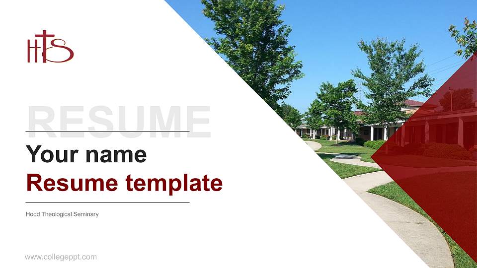 This Resume template features a matching cover, school emblem, and theme colors for Hood Theological Seminary. After purchase, you can modify theme colors, edit slide content, and master slides. Find this template with keywords like Resume, Hood Theological Seminary PPT template, PPT template, and more.