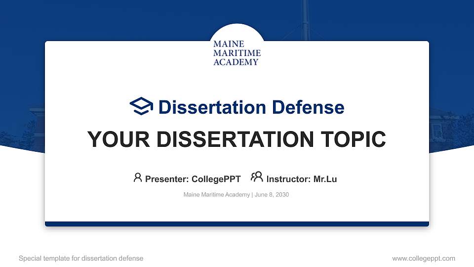 This Thesis Defense template features a matching cover, school emblem, and theme colors for Maine Maritime Academy. After purchase, you can modify theme colors, edit slide content, and master slides. Find this template with keywords like Thesis Defense, Maine Maritime Academy PPT template, PPT template, and more.