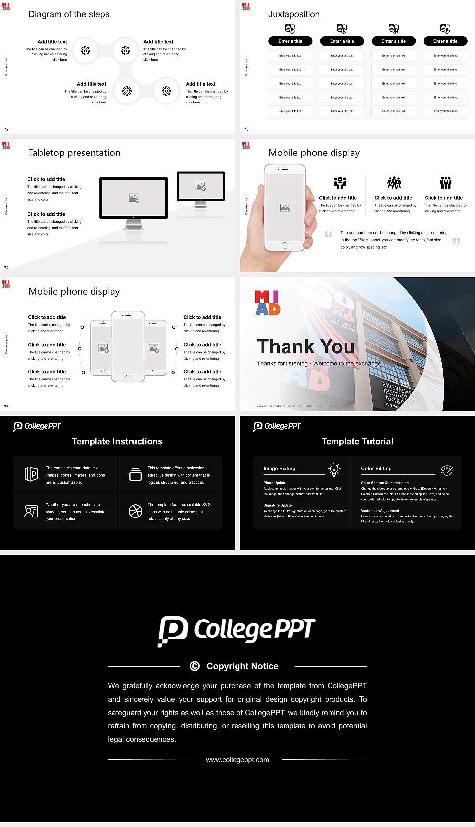 이 템플릿은 Milwaukee Institute of Art & Design 프로젝트에서 널리 사용될 수 있으며, 교수진과 학생들에게 효율적인 프레젠테이션 도구를 제공하여 프레젠테이션 결과를 향상시키는 데 도움이 됩니다. 템플릿을 사용하여 프레젠테이션을 만들 때, 장치 해상도가 템플릿 비율과 일치하는지 확인하여 최상의 효과를 얻으세요.