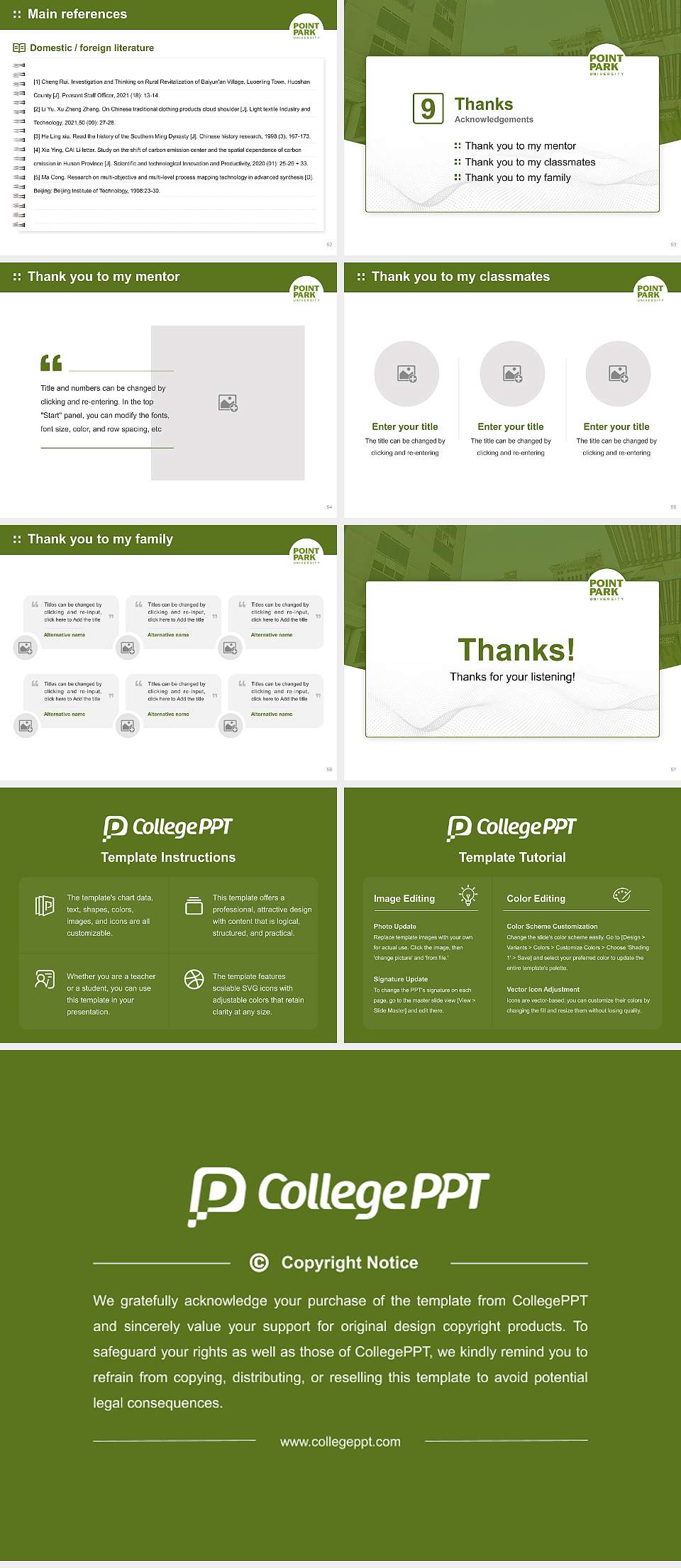 此模板用于论文答辩,具有与波因特帕克大学匹配的封面、校徽和主题色。购买后,您可以修改主题色、编辑幻灯片内容以及母版幻灯片。您可以通过波因特帕克大学、论文答辩 PPT模板、PPT模板等关键词找到该模板。