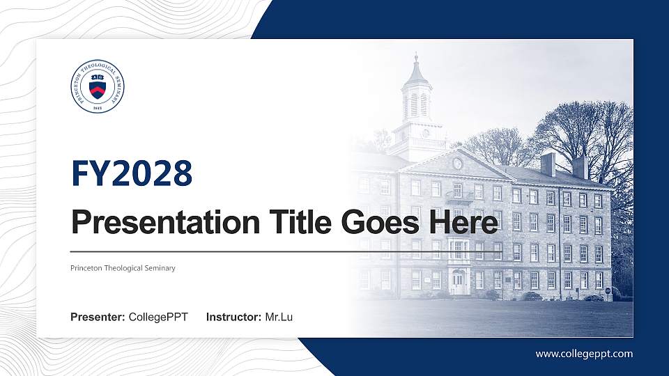 此模板用于学术,具有与普林斯顿神学院匹配的封面、校徽和主题色。购买后,您可以修改主题色、编辑幻灯片内容以及母版幻灯片。您可以通过普林斯顿神学院、学术 PPT模板、PPT模板等关键词找到该模板。