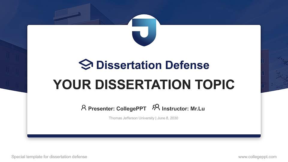 This Thesis Defense template features a matching cover, school emblem, and theme colors for Thomas Jefferson University. After purchase, you can modify theme colors, edit slide content, and master slides. Find this template with keywords like Thesis Defense, Thomas Jefferson University PPT template, PPT template, and more.