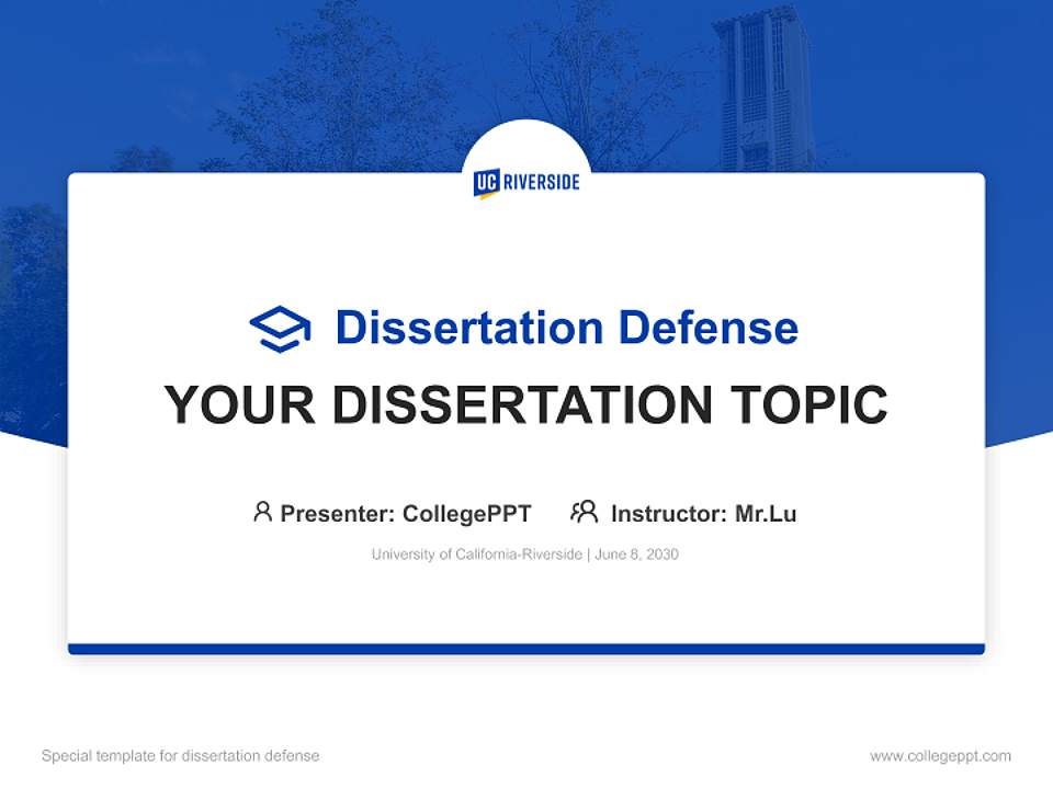 This Thesis Defense template features a matching cover, school emblem, and theme colors for University of California-Riverside. After purchase, you can modify theme colors, edit slide content, and master slides. Find this template with keywords like Thesis Defense, University of California-Riverside PPT template, PPT template, and more.