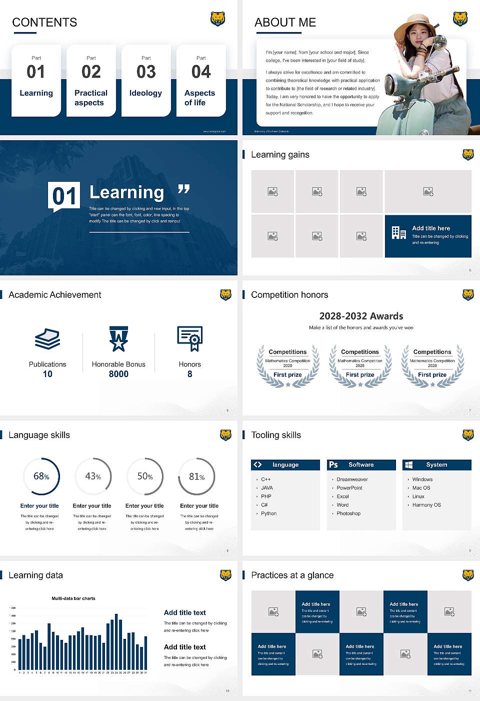 This Scholarship Defense template features a matching cover, school emblem, and theme colors for University of Northern Colorado. After purchase, you can modify theme colors, edit slide content, and master slides. Find this template with keywords like Scholarship Defense, University of Northern Colorado PPT template, PPT template, and more.