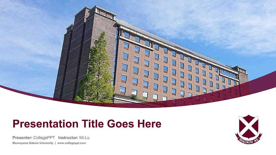 This Lesson template features a matching cover, school emblem, and theme colors for Momoyama Gakuin University. After purchase, you can modify theme colors, edit slide content, and master slides. Find this template with keywords like Lesson, Momoyama Gakuin University PPT template, PPT template, and more.