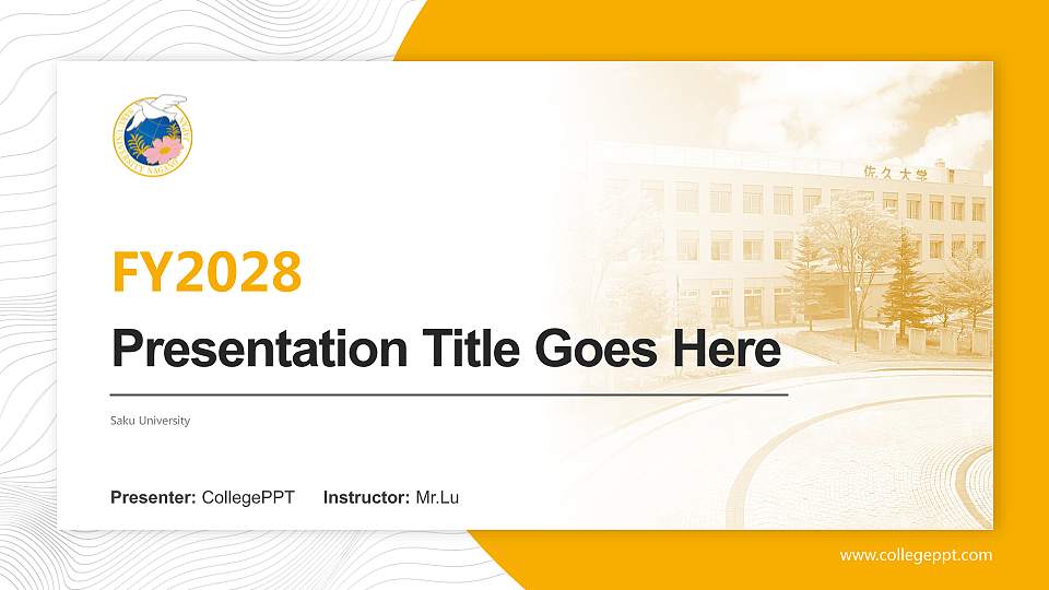 This Academic template features a matching cover, school emblem, and theme colors for Saku University. After purchase, you can modify theme colors, edit slide content, and master slides. Find this template with keywords like Academic, Saku University PPT template, PPT template, and more.