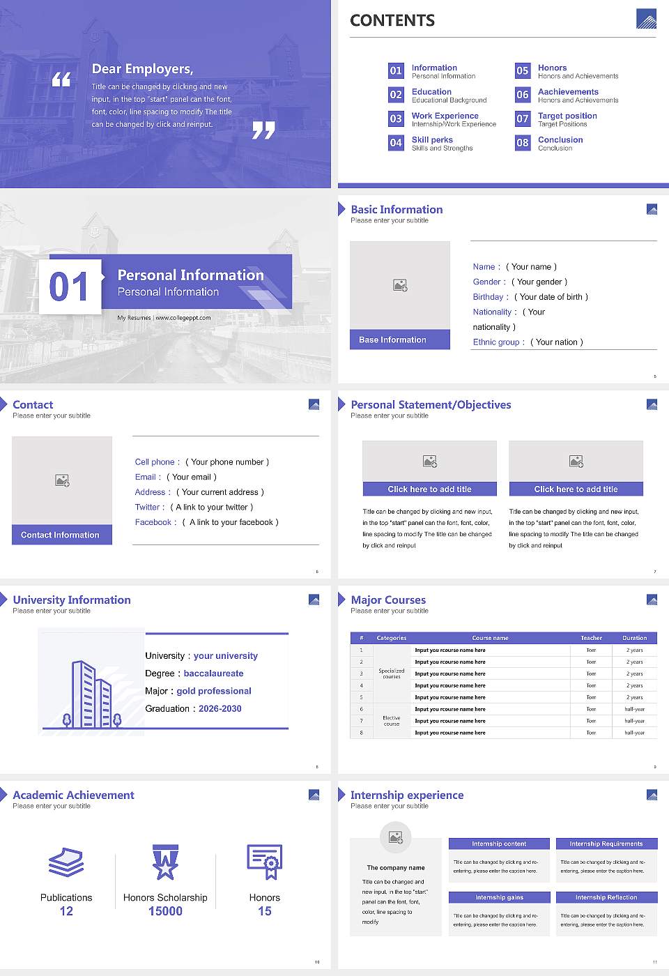 Ce modèle pour CV comporte une couverture assortie, un emblème de l'école et des couleurs de thème spécifiques à Tokyo Fuji University. Après l'achat, vous pouvez modifier les couleurs du thème, éditer le contenu des diapositives et les diapositives maîtresses. Vous pouvez trouver ce modèle en utilisant des mots-clés tels que Tokyo Fuji University, modèle PPT CV, modèle PPT, et plus encore.