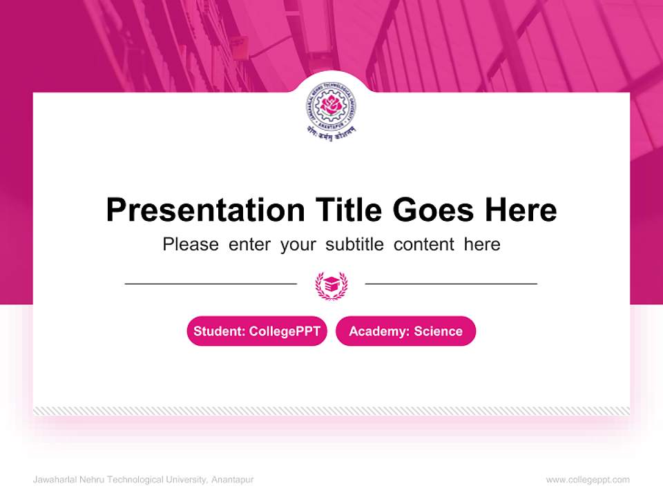 このテンプレートは、Jawaharlal Nehru Technological University, Anantapurプロジェクトで広く使用され、教職員や学生に効率的なプレゼンテーションツールを提供し、プレゼンテーションの結果を向上させるのに役立ちます。テンプレートを使用してプレゼンテーションを作成する際は、デバイスの解像度がテンプレートの比率に一致していることを確認し、最良の効果を得てください。