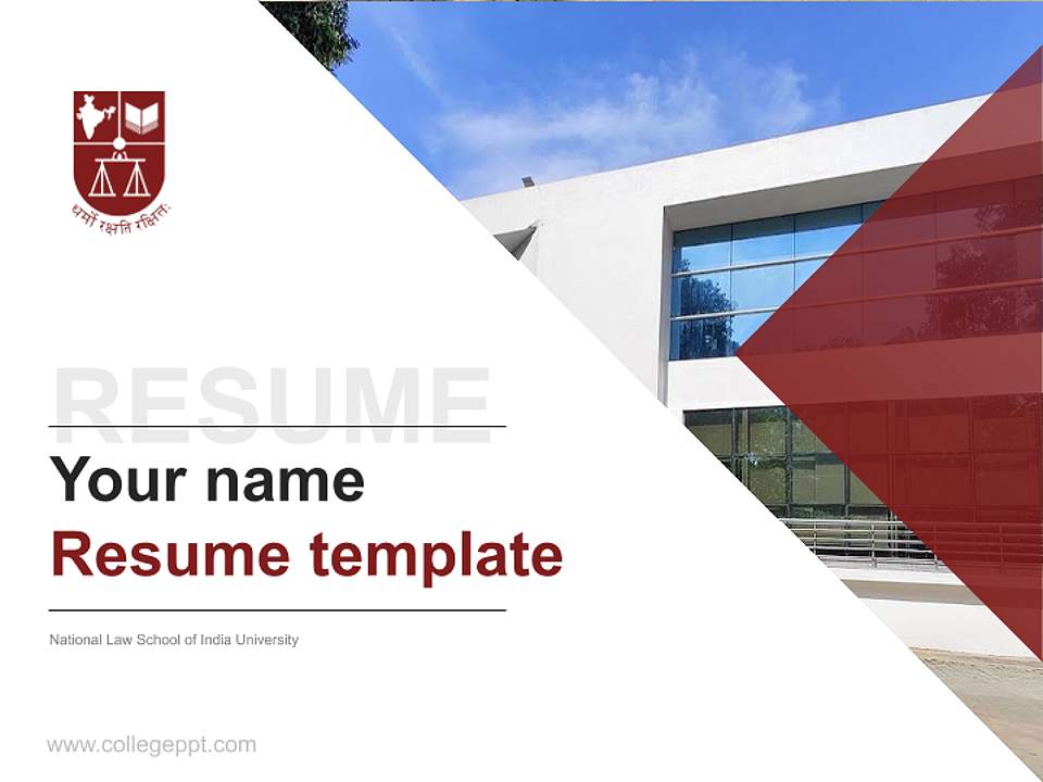 This Resume template features a matching cover, school emblem, and theme colors for National Law School of India University. After purchase, you can modify theme colors, edit slide content, and master slides. Find this template with keywords like Resume, National Law School of India University PPT template, PPT template, and more.