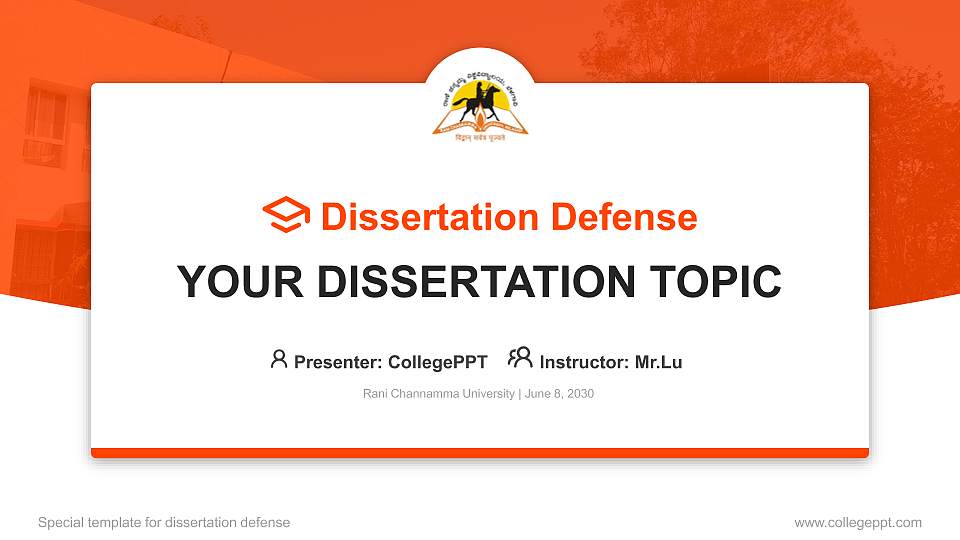 This Thesis Defense template features a matching cover, school emblem, and theme colors for Rani Channamma University. After purchase, you can modify theme colors, edit slide content, and master slides. Find this template with keywords like Thesis Defense, Rani Channamma University PPT template, PPT template, and more.