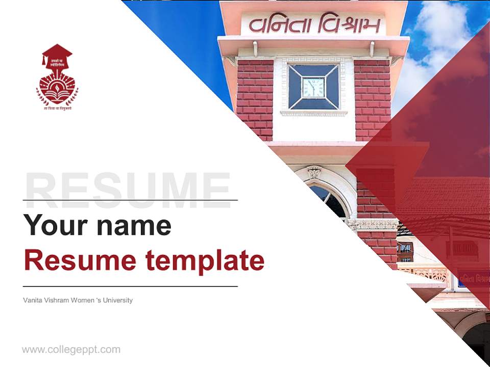 此模板用于简历,具有与瓦妮塔·维什拉姆女子大学匹配的封面、校徽和主题色。购买后,您可以修改主题色、编辑幻灯片内容以及母版幻灯片。您可以通过瓦妮塔·维什拉姆女子大学、简历 PPT模板、PPT模板等关键词找到该模板。