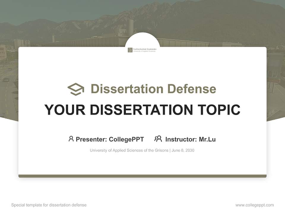 此模板用于论文答辩,具有与格劳宾登应用科学大学匹配的封面、校徽和主题色。购买后,您可以修改主题色、编辑幻灯片内容以及母版幻灯片。您可以通过格劳宾登应用科学大学、论文答辩 PPT模板、PPT模板等关键词找到该模板。