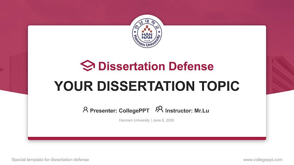 This Thesis Defense template features a matching cover, school emblem, and theme colors for Hannam University. After purchase, you can modify theme colors, edit slide content, and master slides. Find this template with keywords like Thesis Defense, Hannam University PPT template, PPT template, and more.