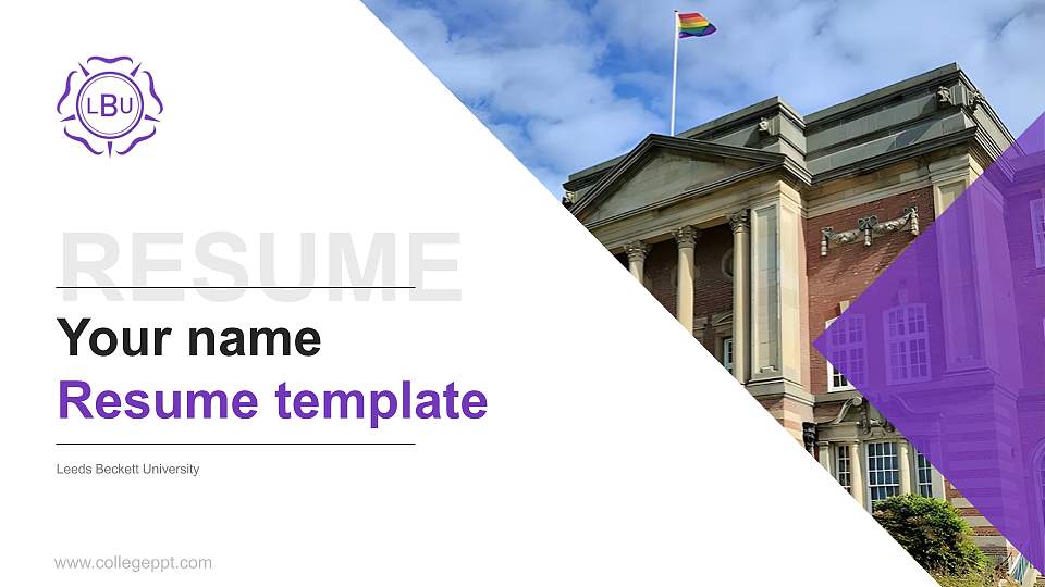 此模板用于简历,具有与利兹贝克特大学匹配的封面、校徽和主题色。购买后,您可以修改主题色、编辑幻灯片内容以及母版幻灯片。您可以通过利兹贝克特大学、简历 PPT模板、PPT模板等关键词找到该模板。