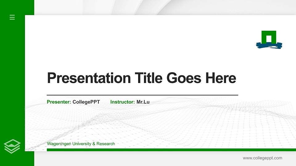 Templat ini boleh digunakan secara meluas dalam projek Wageningen University & Research, menyediakan alat persembahan yang cekap untuk fakulti dan pelajar, membantu meningkatkan hasil persembahan. Apabila menggunakan templat untuk membuat persembahan, pastikan resolusi peranti sepadan dengan nisbah templat untuk kesan terbaik.