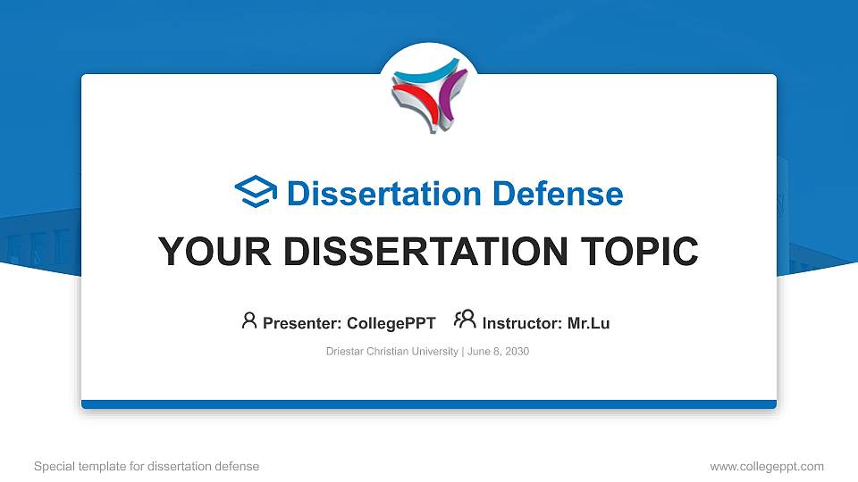 This Thesis Defense template features a matching cover, school emblem, and theme colors for Driestar Christian University. After purchase, you can modify theme colors, edit slide content, and master slides. Find this template with keywords like Thesis Defense, Driestar Christian University PPT template, PPT template, and more.